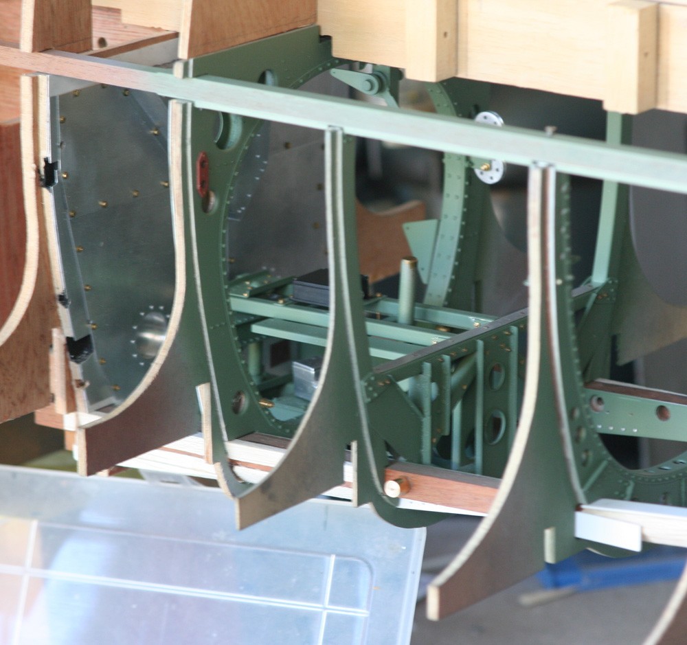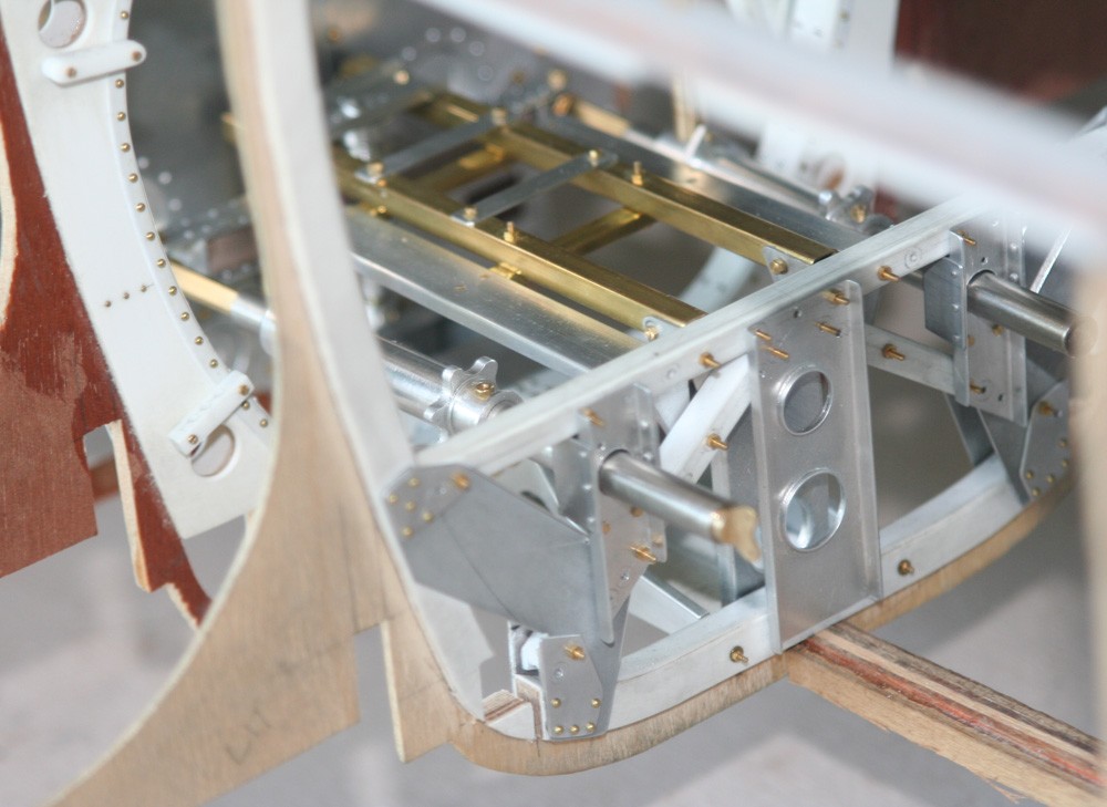 A conspicuous feature within the lower fuselage is the substantive sub-assembly supporting rudder pedals, heel boards, control column, aileron cable drum and other less obvious items. Being integral with the main frames, this was the next step since it needed to be completed before either they or the longerons could be finalised in position.