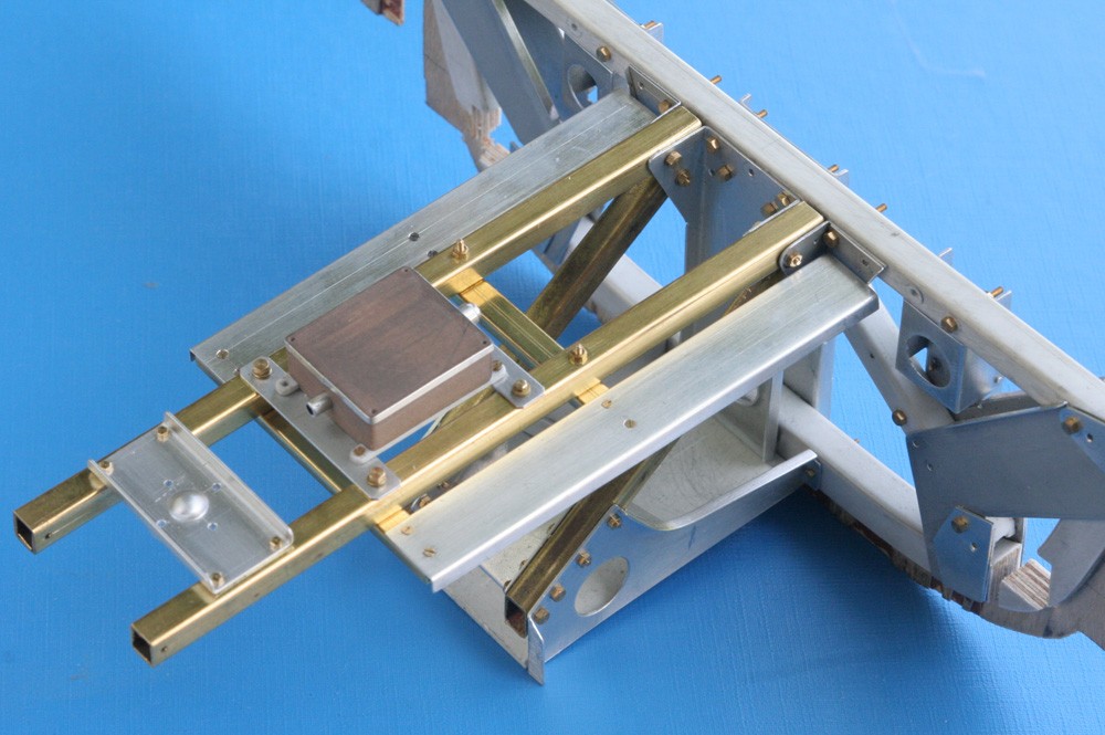 The structure is rooted on two paired beams that run longitudinally about the centreline of the fuselage floor between Fames 7 and 8 and 8 and 9. Various square- or channel-section supports are then added in the vertical horizontal and diagonal planes, effectively creating a raised platform for the heel boards and, notably, the enclosing plate that secures the pintle on which the rudder bars pivot. I built my version as closely as I could to the production drawings, compromising only in minor detail that would be next to invisible in the finished model.