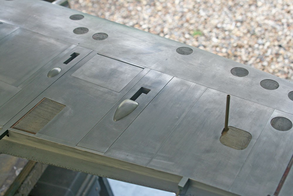 The remainder of the wing skinning process is a pleasure to do. The panels are all strictly rectilinear and arrayed chord wise, perpendicular to the main spar – about as simple as it can get. And since the surface is close to being flat there is no annealing to worry about. Were it not for the three gun port covers with their various blisters and ejector ports, the entire job could be completed in a day or two! But nothing is ever that simple.